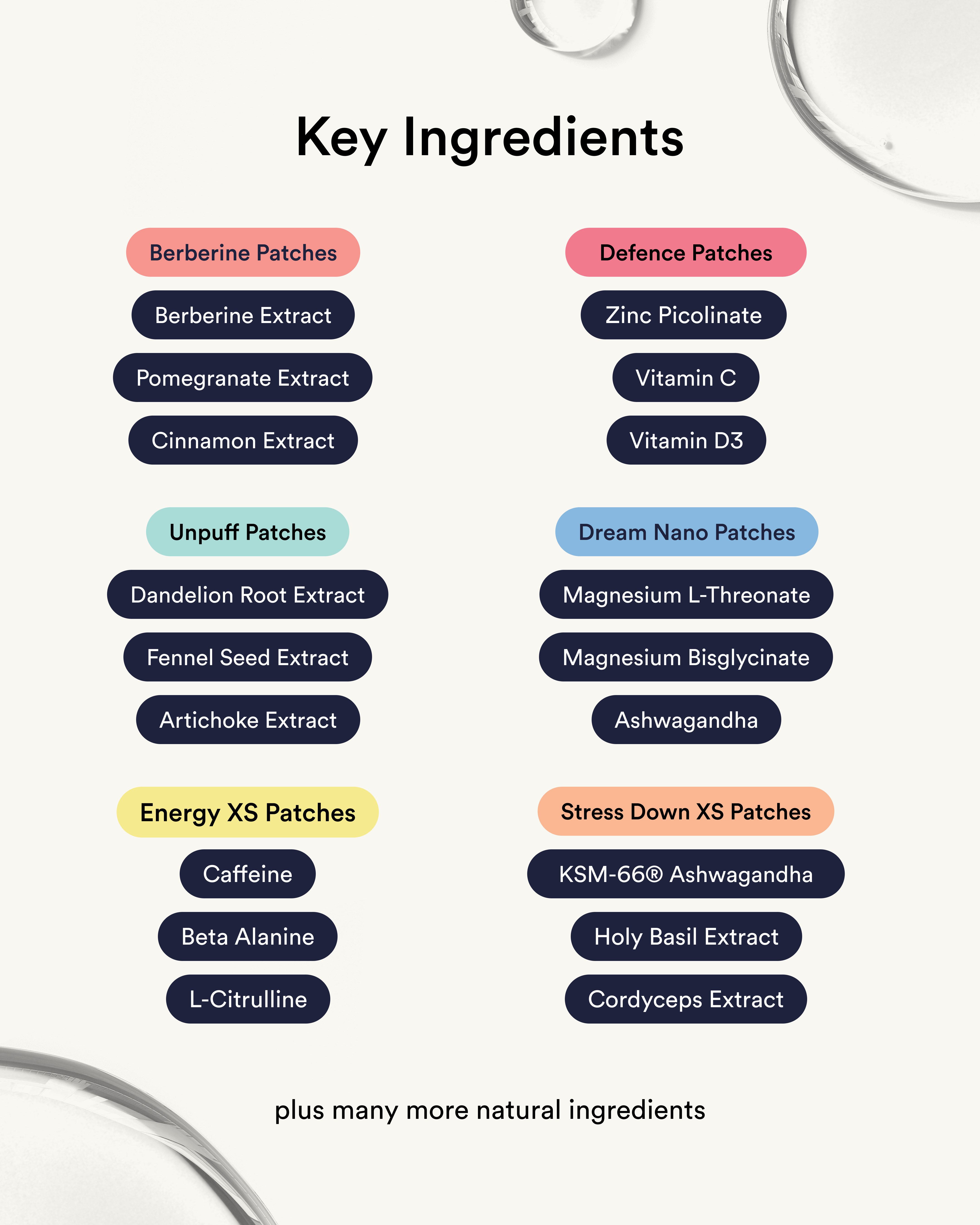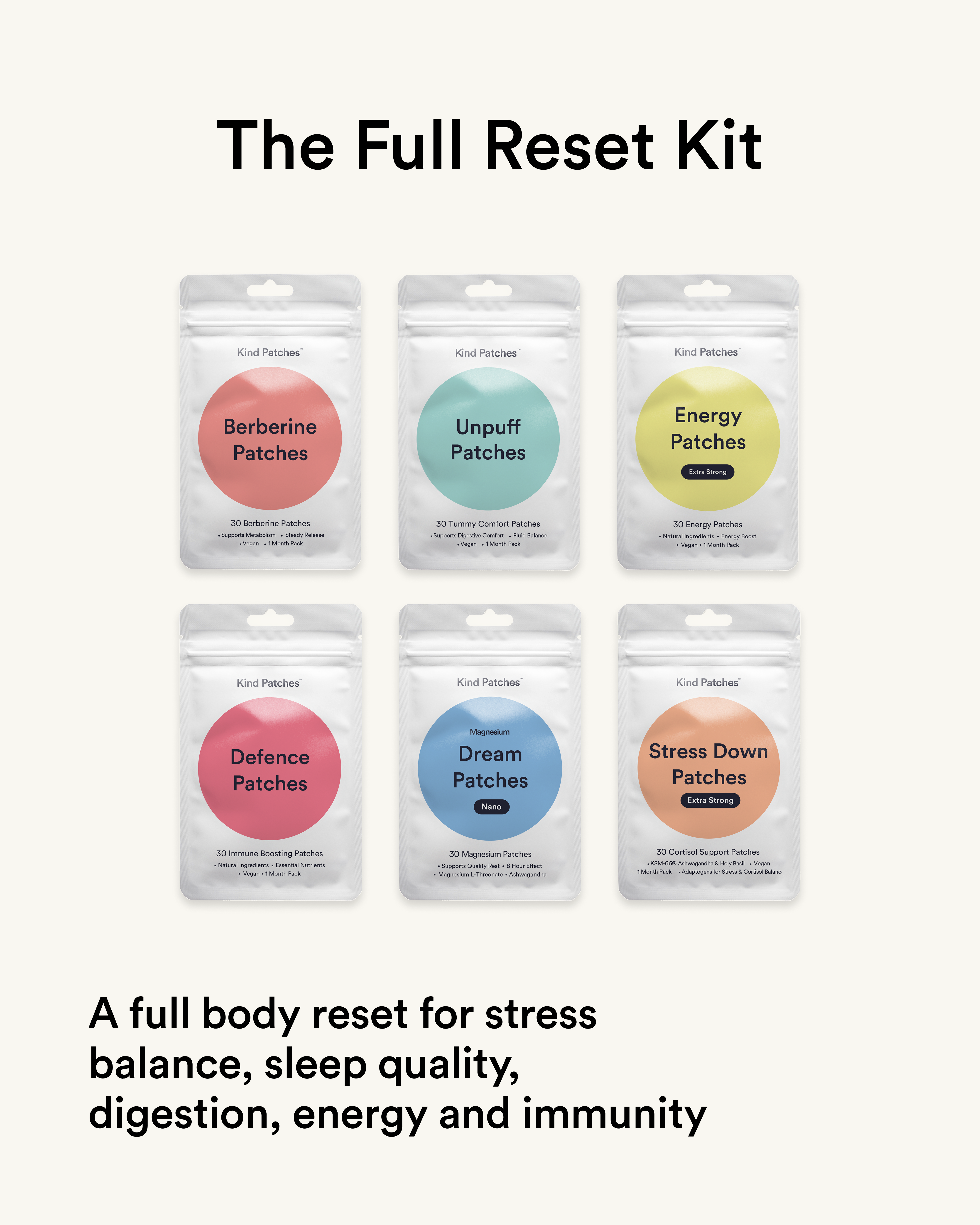 The Full Reset Kit combines six plant-powered patches: Berberine, Unpuff, Defence, Stress Down Extra Strong, Dream and Energy Extra Strong Patches to support your body’s natural rhythm and full body and mind wellness.