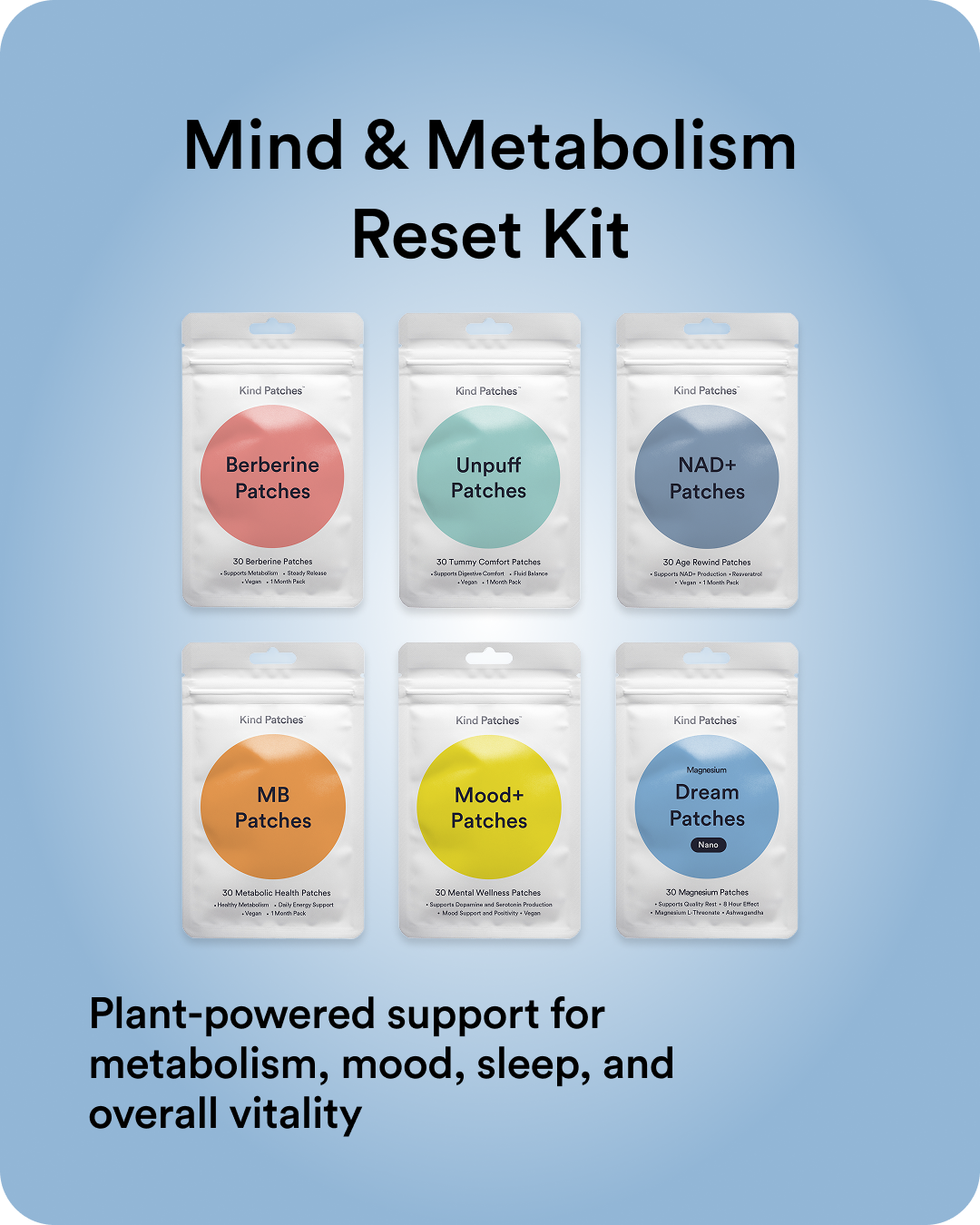 The Mind & Metabolism Reset Kit combines six plant-powered patches: Berberine, Unpuff, MB, Dream Melatonin Extra Strong, Dopamine and NAD+ Patches to support your body’s natural rhythm and full body and mind wellness.