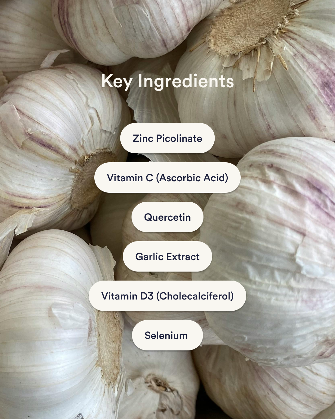 Zinc Picolinate 10mg, Vitamin C (Ascorbic Acid) 6.5mg, Quercetin 5.9mg, Garlic Extract 2.5mg, Vitamin D3 (Cholecalciferol) 50mcg, Selenium 50mcg