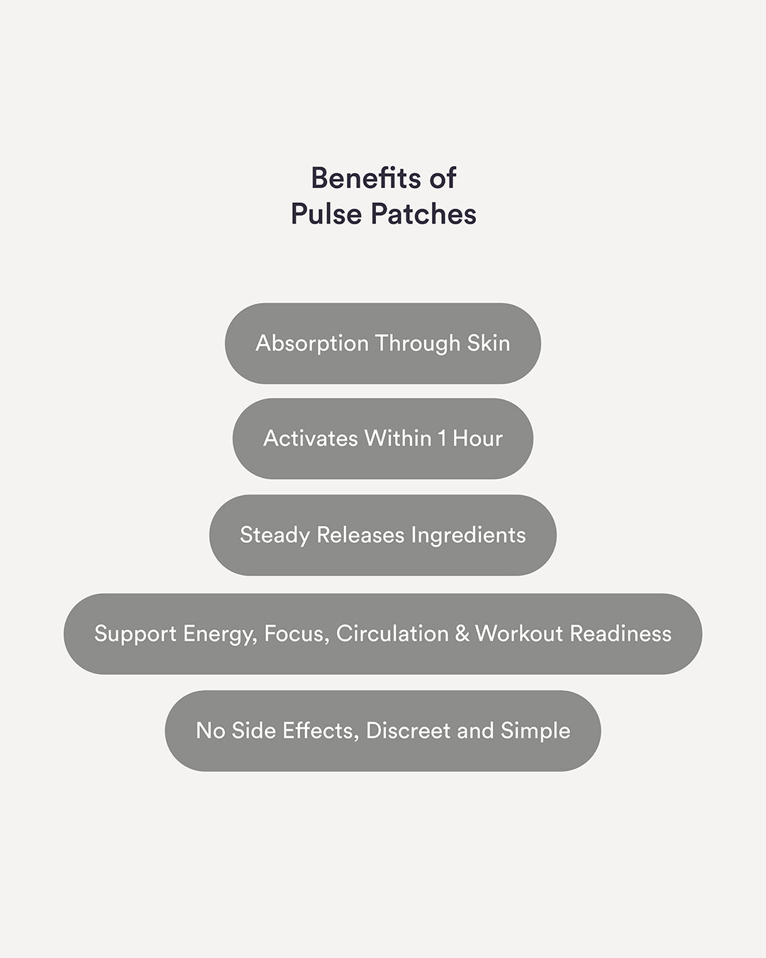 This is not a pre-workout replacement. Pulse is a lifestyle performance patch for people who want to feel ready in their body before they move. Using advanced transdermal delivery, each patch provides up to 8 hours of sustained support through the skin, helping your body prepare for movement without energy spikes or crashes. Vegan, convenient, and designed for real life.